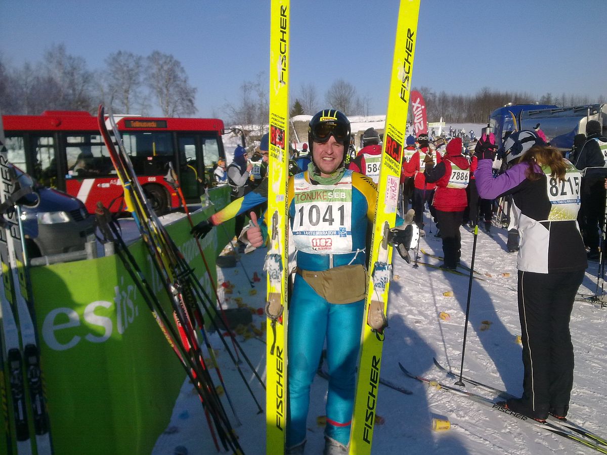 63km läbimiseks kulus aega täpselt 7 tundi ja 17 minutit – see andis diplomile 4346.koha (kuna kõigil kiibid finišeerimist ei fikseerinud, selgus hiljem, et tegelik koht on hoopis 4500). Suusad libisesid lausa super hästi ja pidamisega oli ka enam vähem okei – Peebu TP-s pidin pidamist juurde määrima. Külmaga võitlema ei pidanud, küll aga kuumaga... Ah et miks mul nii kaua läks?! Heh, sest tegin teoks oma ammuse unistuse: läbida Tartu Maraton hüppesuuskadega. Ja mitte ainult hüppesuuskadega, vaid et asjal oleks tõesti mõtet, siis ka suusahüppe varustuses. (Olgu siinkohal ausalt üles tunnistatud, et kuna suusahüppe saabastega ei saa jalga sugugi sirgu ajada ja ka õiget klassikasammu pole võimalik teha, siis nendest sai siiski loobutud üsna tavaliste kirsa-tüüpi töösaabaste kasuks, mis kenasti suusale kinnitusid.) Selle idee generaatoriks oli küll tegelikult minu hea sõber suusahüppe veteranide maailmameister Hillar Irves, kellel oli plaan saada esimeseks hüppesuuskadega Tartu Maratoni läbijaks. Paraku aga võttis ta liiga pikalt selleks hoogu ja kui mullu legendaarne kahevõistleja Tambet Pikkor selle au endale noppis (ajaga 8:00:24), loovutas Hillar oma hüppesuusad tänavu mulle. Ise läks ta sõitma kõva tulemust, et Vasaloppetil parem stardipositsioon saada. Hillariga koos Otepääle saabusimegi ja kella 8 ajal näitas auto termomeeter, et väljas on miinus 30,5 kraadi. Autost väljudes küll asi päris nii hull ei tundunud, kuid krõbe oli küll. Silkasin stardinumbrite järgi ning et aega oli, jalutasin ning uurisin kuidas ma stardikoridori oma laiade suuskadega ära mahun.